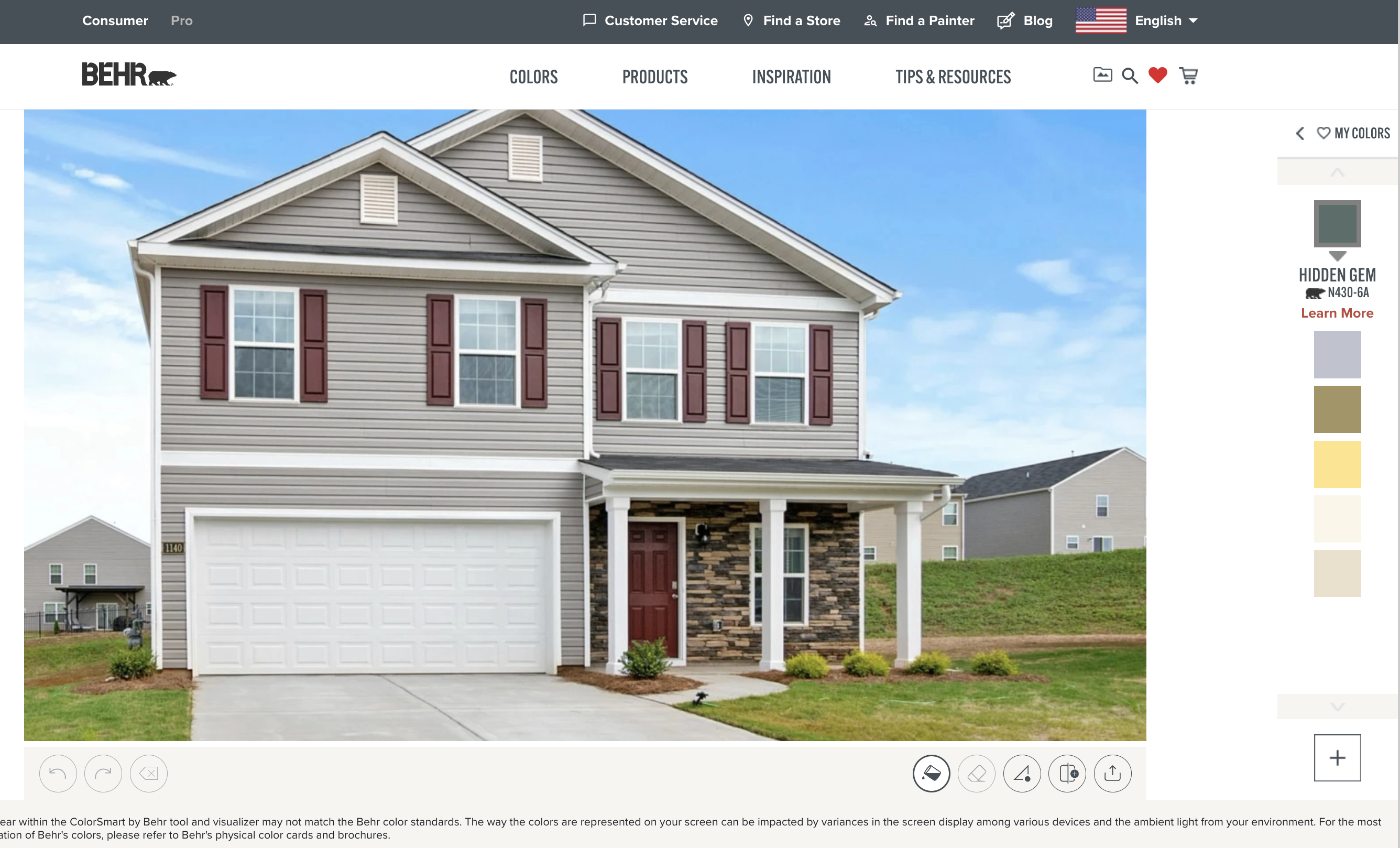 Siding Verdict: Poor. It is very time-consuming to get even basic results from the Behr Visualizer on siding, the light quality is poor, and after that work is complete you can't reuse your work on a new color.