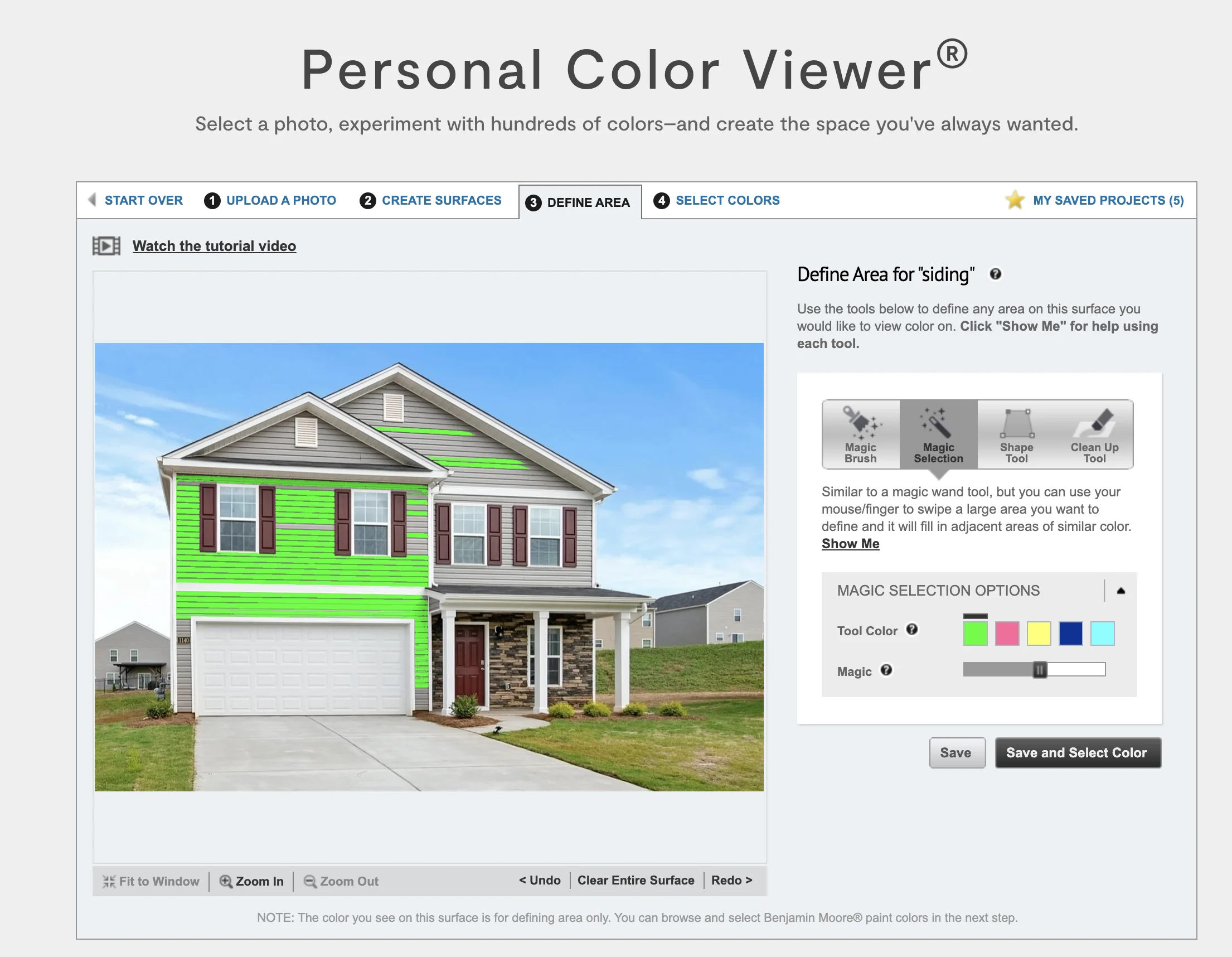 Benjamin Moore's Personal Color Viewer offers a paint brush masking system with three tools: "Magic Brush" for brush-style painting, "Magic Selection" for flood fill, and "Shape" for polygon selection. Benjamin Moore's visualizer allows reusing your mask work on different colors and creating multiple masks.